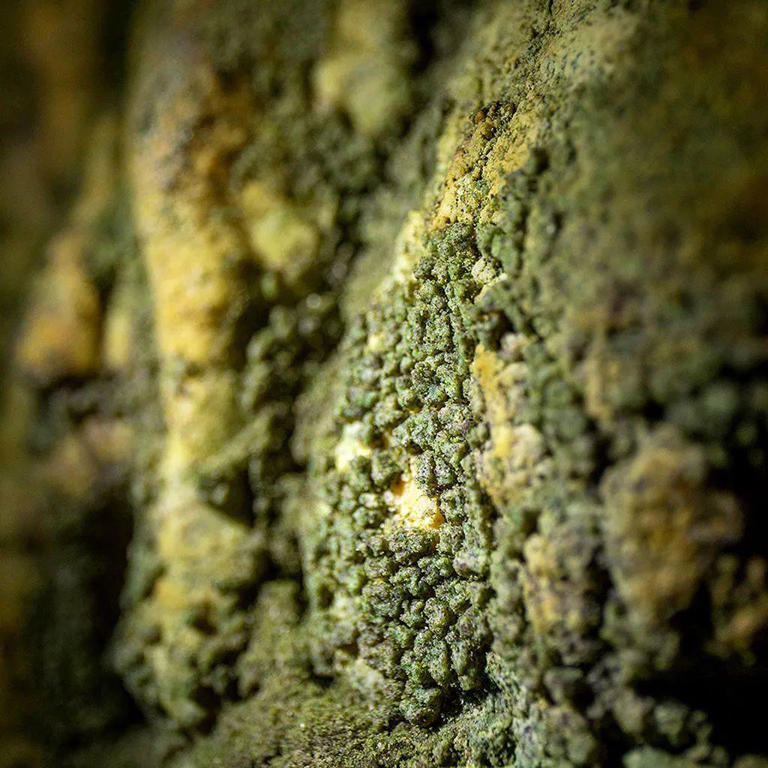 Behrendt acendeu uma tocha e, mesmo com a alcova totalmente escura, a luz revelou uma camada de micróbios verdes agarrados à parede.