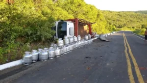 O tombamento chamou a atenção de quem passava pelo local, principalmente por se tratar de uma carga de botijões de gás.