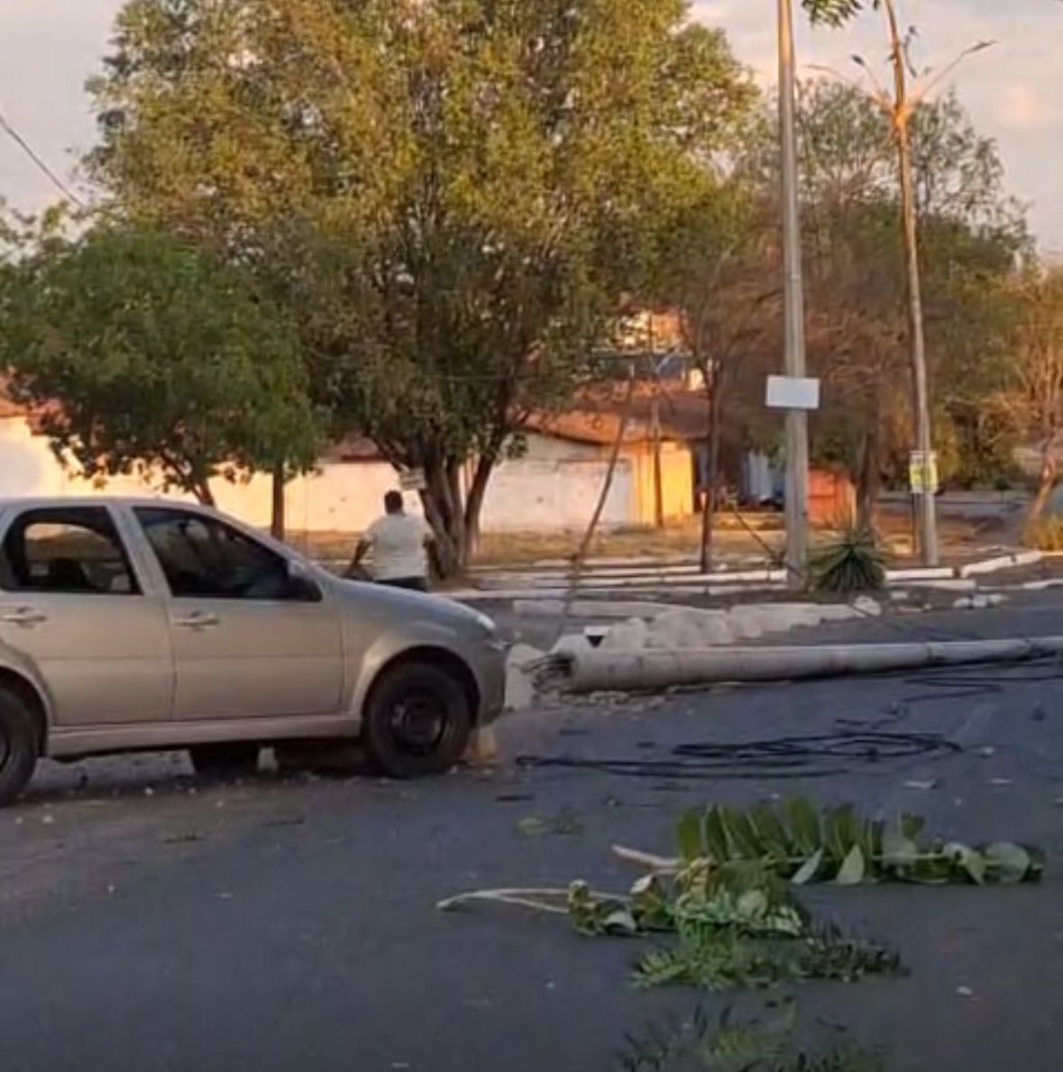 O carro seguia abandonado próximo ao poste danificado, e a comunidade cobrava uma resposta rápida das autoridades para evitar novas ocorrências.