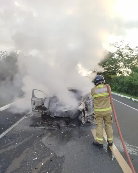 De acordo com as informações iniciais, o condutor de um veículo modelo Polo conseguiu sair do automóvel antes que as chamas se alastrassem, evitando ferimentos mais graves.