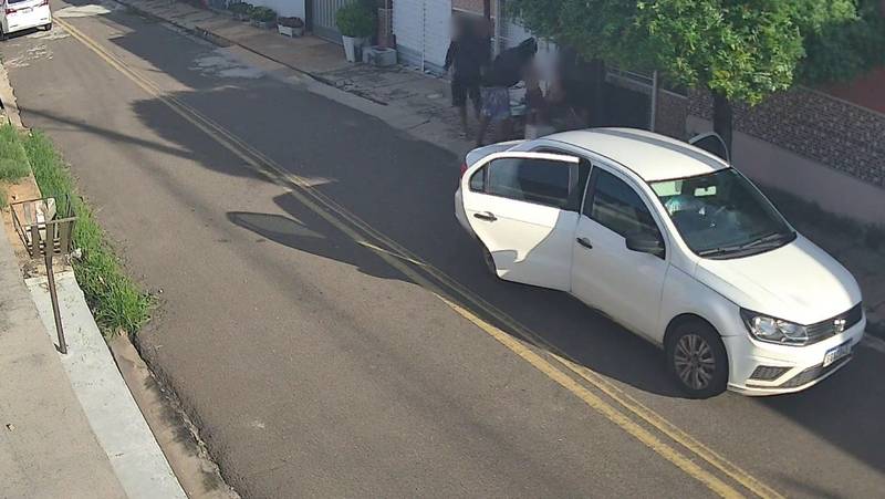 Nas imagens, um idoso e o neto aparecem na calçada quando são surpreendidos por três homens armados que chegam em um carro. Os suspeitos descem do veículo, abordam as vítimas na porta da residência e invadem o imóvel. Em um dos momentos mais tensos, um dos criminosos chega a pegar a criança no colo durante a ação.