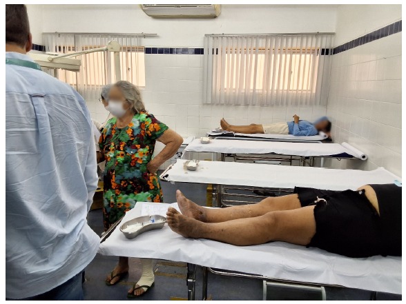 Todos os procedimentos eram feitos em uma única sala com nove leitos, sem biombos, com alguns pacientes, homens e mulheres, necessitando ficar apenas com roupa íntima e com uma bata descartável semitransparente, sem conforto térmico e acústico. No local de realização dos procedimentos não tinha cardioversor, apenas DEA.
