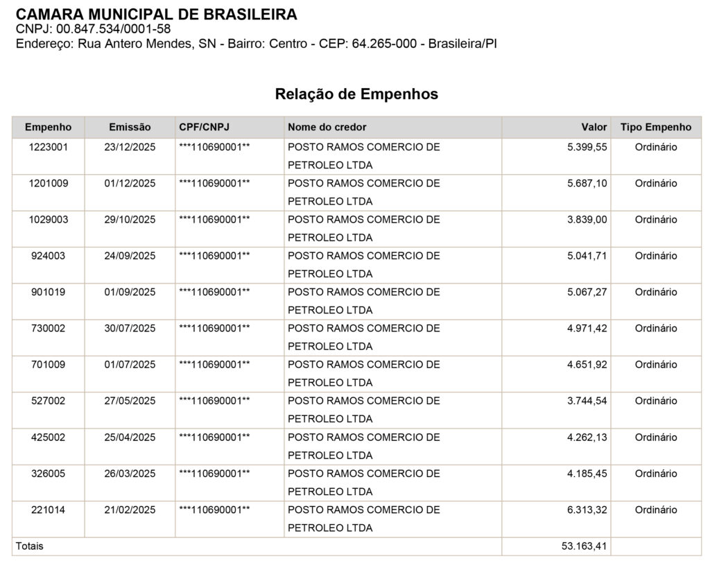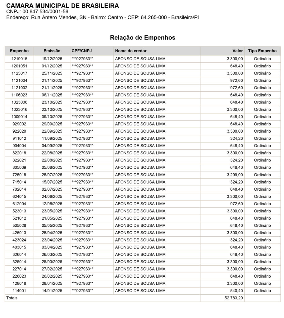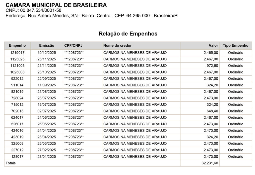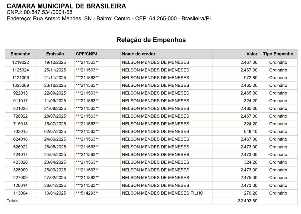 O Portal Atualize recebeu uma denúncia que chama a atenção para gastos e pagamentos realizados pela Câmara Municipal de Brasileira, município localizado a cerca de 180 quilômetros de Teresina.