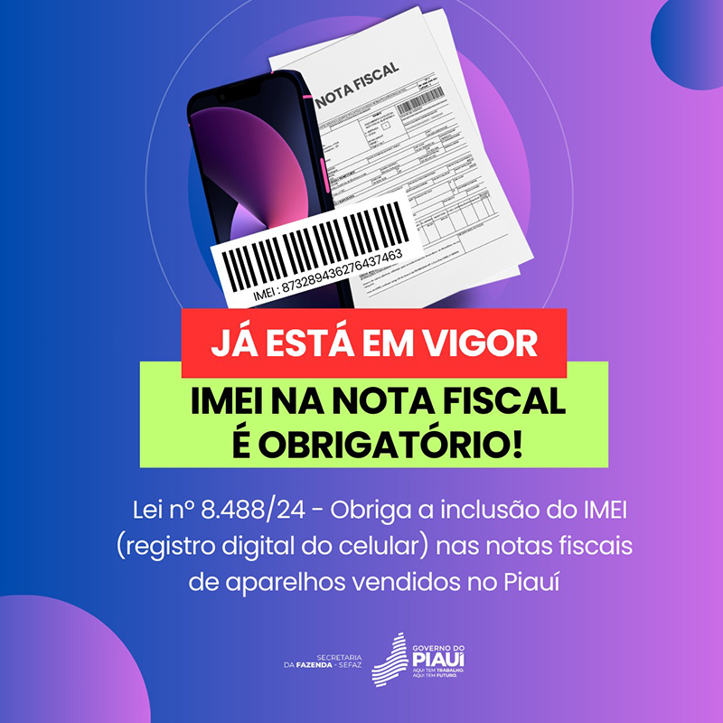A Secretaria Estadual da Fazenda do Piauí (SEFAZ-PI) alerta que já está em vigor a lei estadual que obriga a emissão do IMEI na nota fiscal, que é o registro digital dos aparelhos celulares.