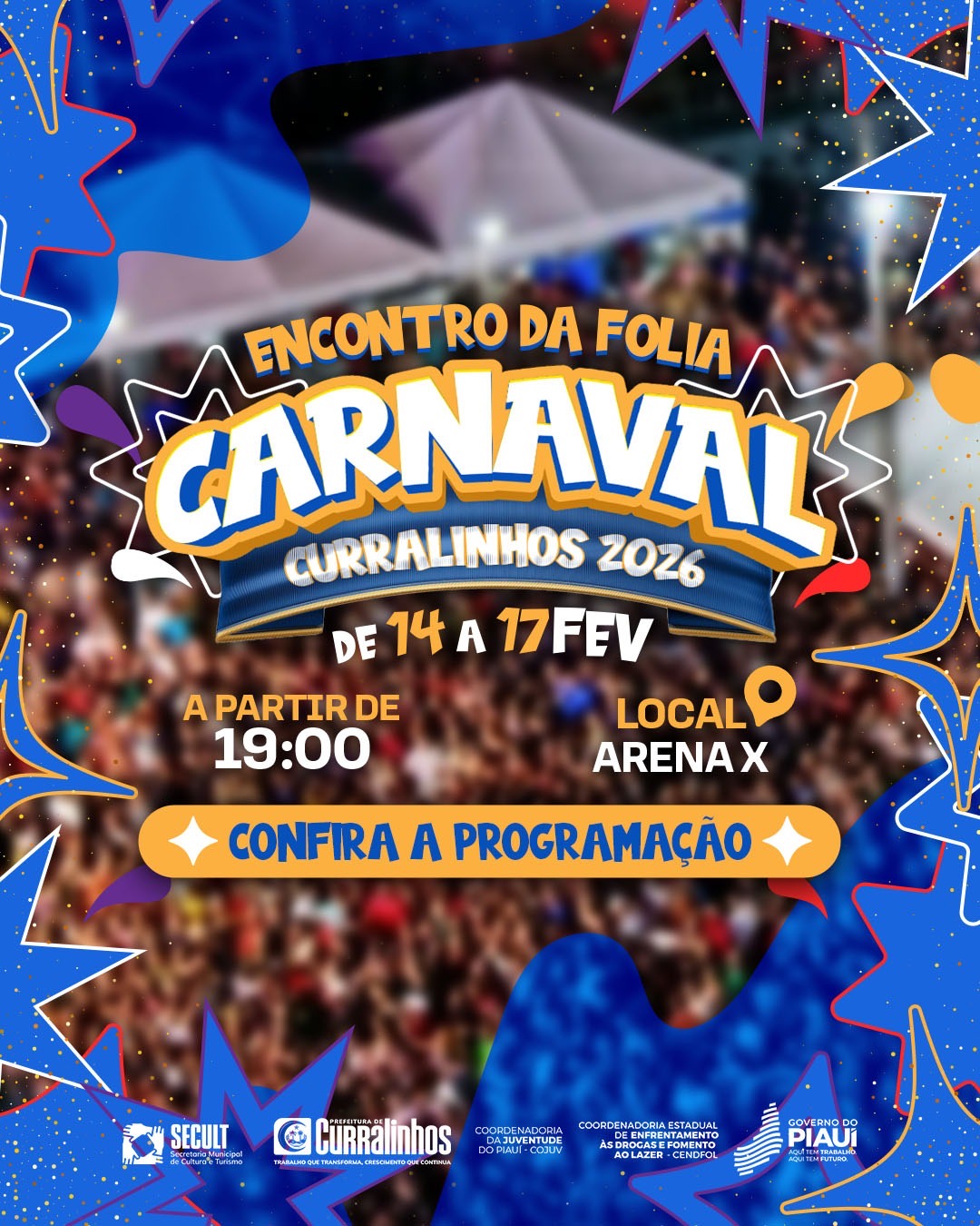 Curralinhos realiza de 14 a 17 de fevereiro o Carnaval 2026 na Arena X. As apresentações começam às 19h de sábado a segunda-feira e às 17h na terça-feira. O evento contará com atrações musicais locais e regionais.