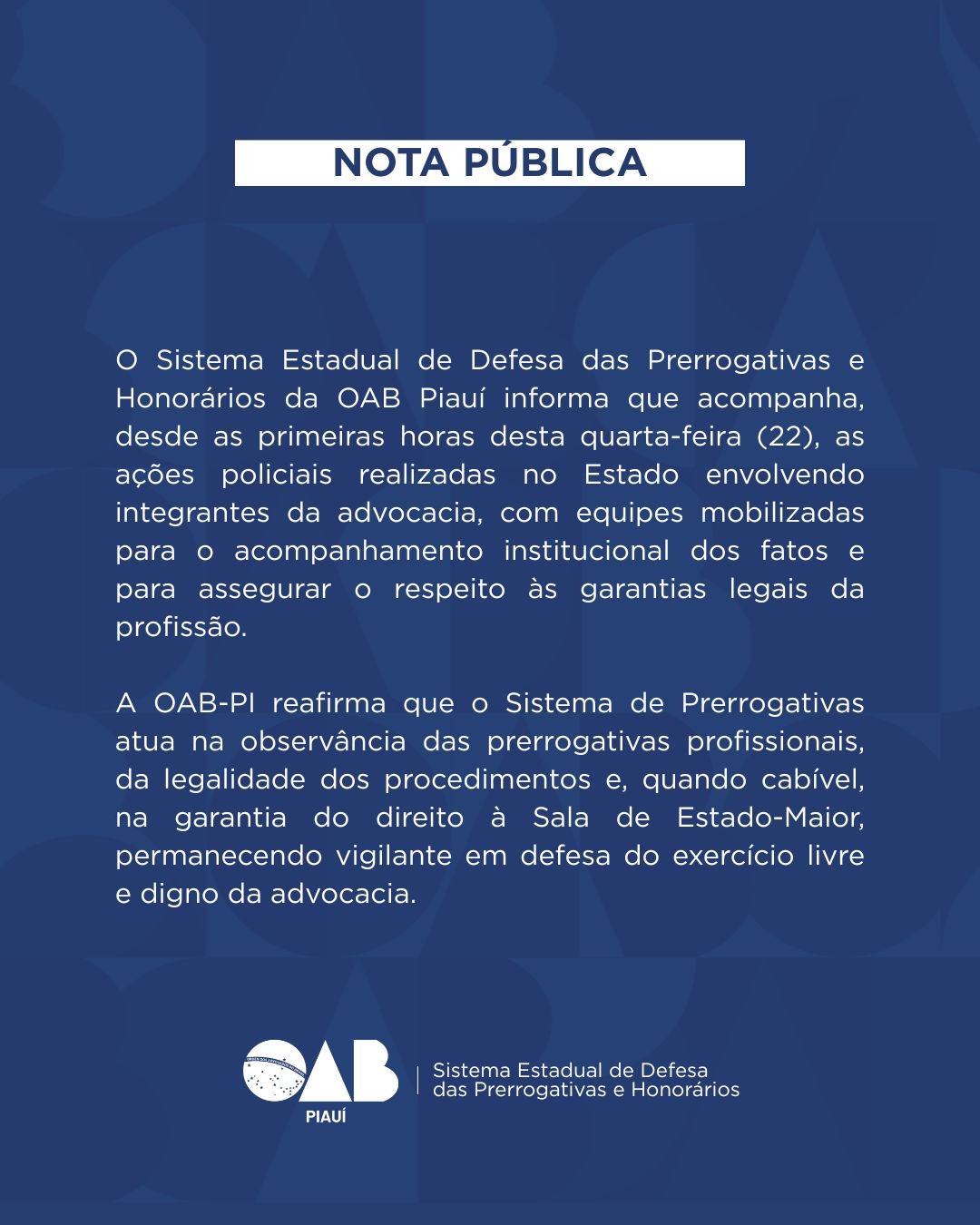 A Ordem dos Advogados do Brasil, seccional Piauí, acompanha o caso para garantir as prerrogativas dos advogados investigados.