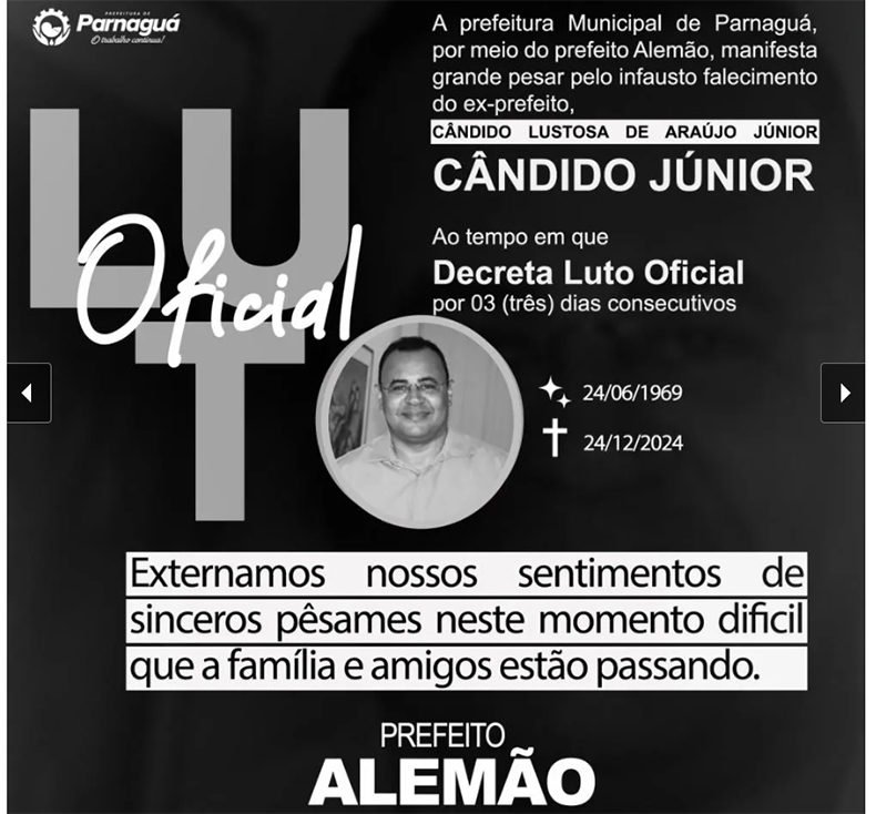 Alemão, atual prefeito de Parnaguá, manifestou pesar por meio de nota e decretou luto oficial de três dias na cidade.
