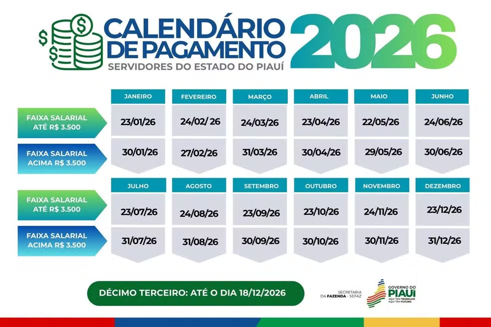 O anúncio foi feito pelo próprio governador por meio das redes sociais. Na mesma publicação, Rafael Fonteles também informou a liberação antecipada do Calendário de Pagamentos do funcionalismo estadual referente ao ano de 2026, medida que permite aos servidores maior planejamento financeiro.