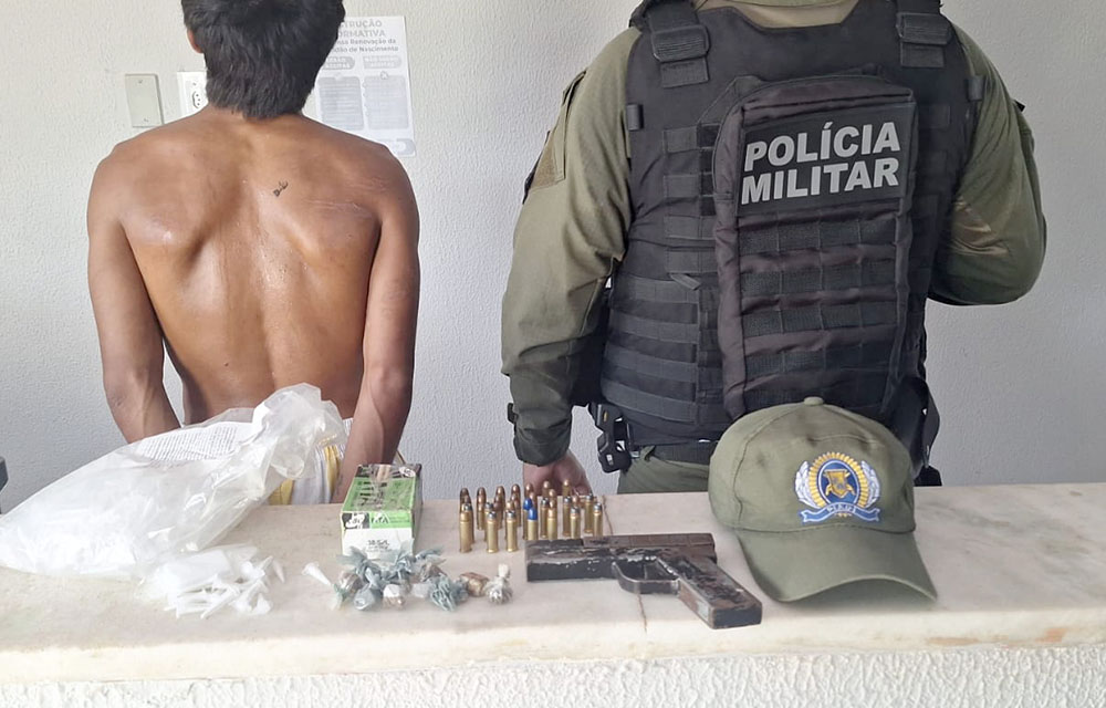 Durante a abordagem, o suspeito informou aos policiais que havia uma arma de fabricação caseira dentro da casa. Com base nos indícios, os militares realizaram buscas no local e encontraram grande quantidade de munições e drogas.