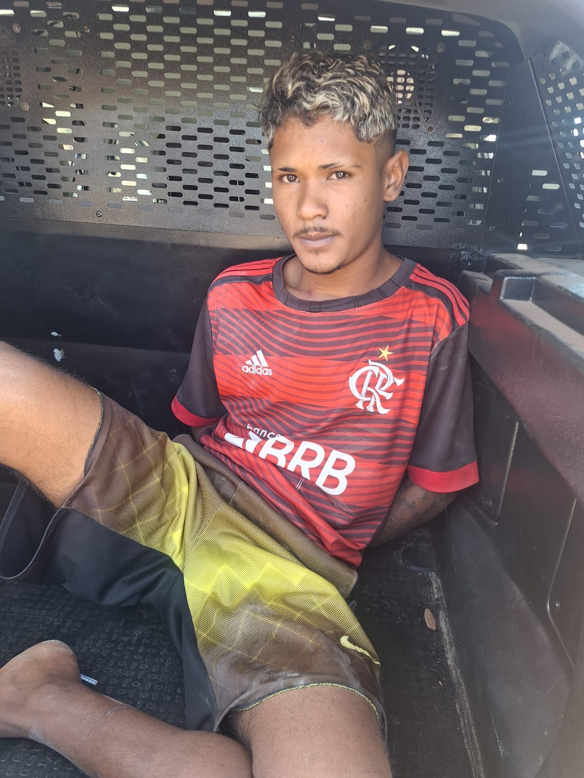 Segundo o relato policial, o jovem tentou fugir e entrou em uma casa abandonada, desobedecendo à ordem de parada. Durante a perseguição, acabou colidindo com uma parede e sofreu ferimentos na orelha e nos pés. Na abordagem, os policiais encontraram com ele um revólver calibre .38 carregado com seis munições, além de uma bolsa preta contendo porções de maconha, crack e cocaína, além de dinheiro em espécie.