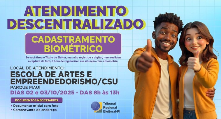 Eleitoras e eleitores de todo o Piauí terão a oportunidade de regularizar a situação eleitoral e coletar biometria nesta quinta (2) e sexta-feira (3), das 8h às 13h, na Escola de Artes e Empreendedorismo – CSU, localizada na Avenida Marechal Rondon, 137, no bairro Parque Piauí, em Teresina.