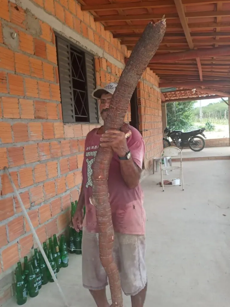 Um agricultor familiar da zona rural de Pimenteiras colheu uma raiz de macaxeira que impressionou pelo tamanho: quase três metros de comprimento e mais de 10 quilos. O registro ocorreu no Assentamento Malhadinha e rapidamente se espalhou entre moradores da região.