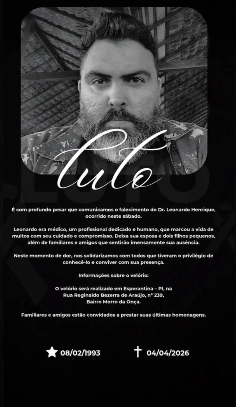 O médico Leonardo Henrique, de 33 anos, morreu na noite de sábado (4), após um acidente de trânsito na rodovia PI-110, no município de Piracuruca, no Norte do Piauí. O profissional, que residia e trabalhava em Esperantina (PI), não resistiu aos ferimentos após uma colisão envolvendo duas motocicletas.