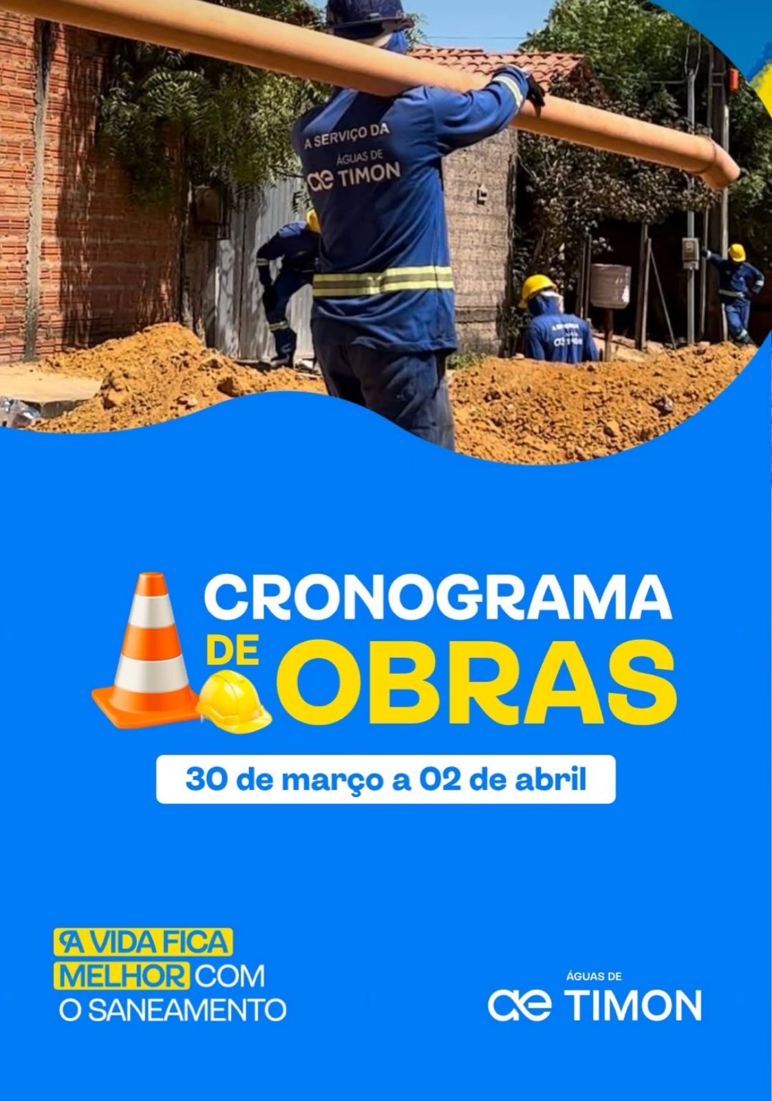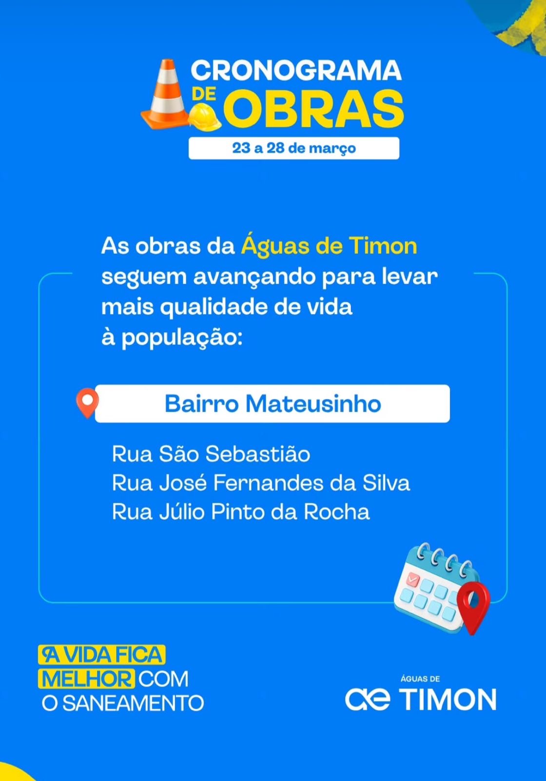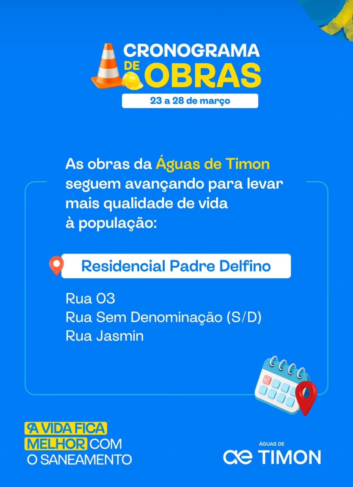 As obras de ampliação da rede de esgotamento sanitário continuam em Timon e, nesta semana, os serviços se concentram em ruas do Residencial Padre Delfino e do bairro Mateusinho. As intervenções acontecem entre os dias 30 de março e 2 de abril.