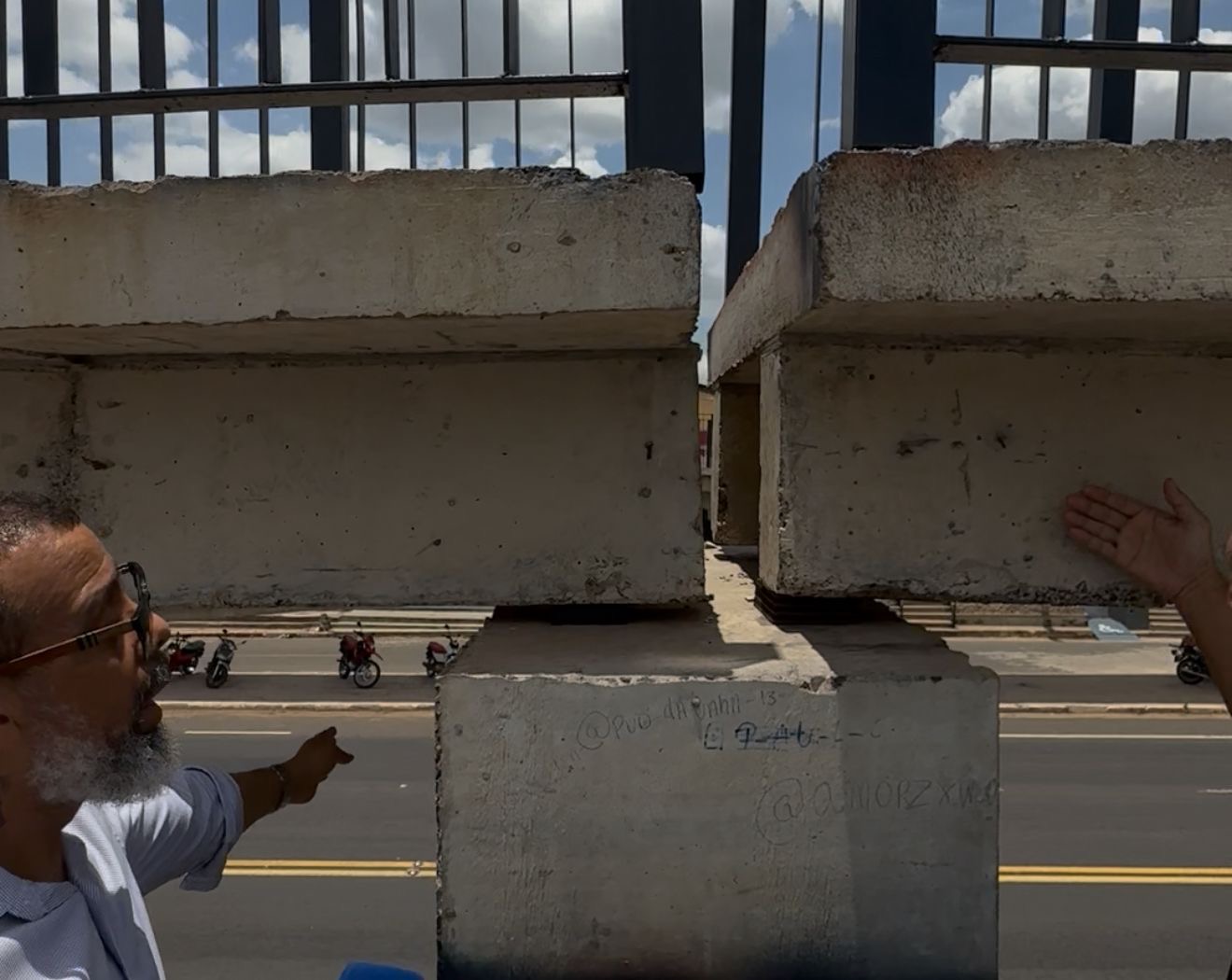 De acordo com Francisco Morais, um caminhão-baú colidiu recentemente com a estrutura de concreto, provocando o deslocamento de algumas peças. As imagens registradas no local mostram os danos visíveis na base e na lateral da passarela.