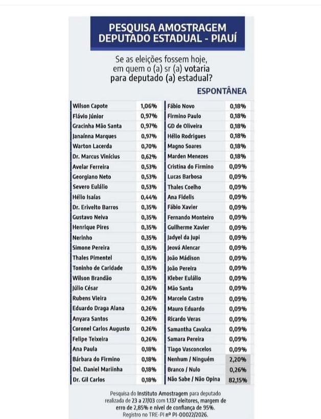 Na liderança aparece Wilson Capote, com 1,06%. Em seguida, estão Flávio Júnior, Gracinha Mão Santa e Janaínna Marques, todos com 0,97%. Logo depois, aparecem Warton Lacerda (0,70%) e Dr. Marcus Vinícius (0,62%).