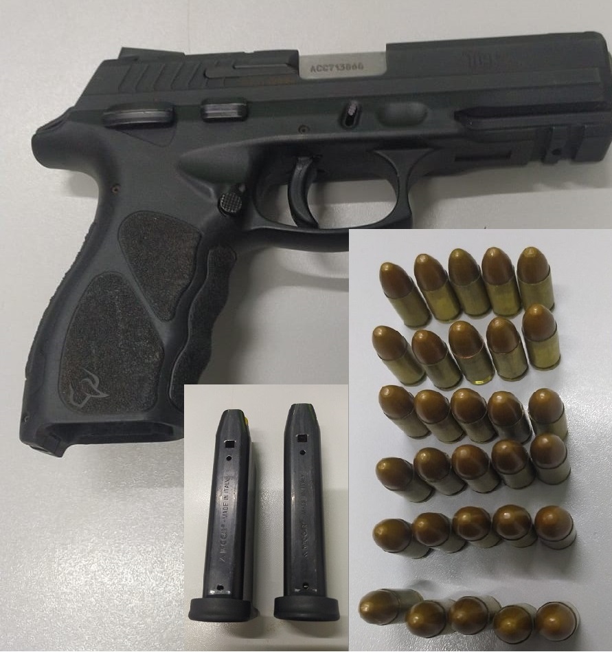 O trio ocupava um veículo modelo VW/Gol (vermelho), e durante a vistoria no interior do automóvel foi encontrado uma pistola calibre 9mm e dois carregadores com 30 munições intactas