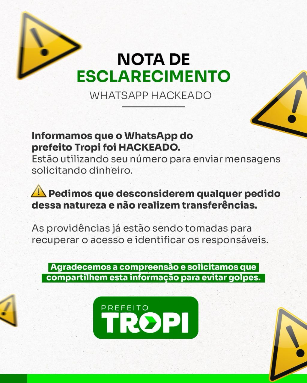 Segundo a publicação, os golpistas estão enviando mensagens pedindo transferências bancárias em nome do prefeito. A equipe de Tropi reforça que nenhuma solicitação desse tipo deve ser atendida e pede que qualquer abordagem suspeita seja ignorada.