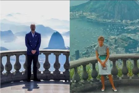 O príncipe William compartilhou, nesta quarta-feira (5), registros de sua visita ao Cristo Redentor, no Rio de Janeiro. As imagens chamaram atenção nas redes sociais por lembrarem o famoso ensaio fotográfico de sua mãe, princesa Diana, realizado no mesmo local durante visita ao Brasil em 1991.