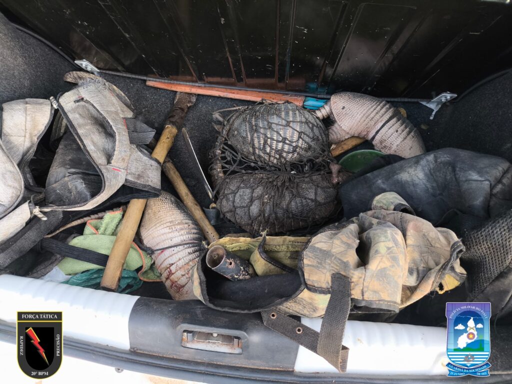 Cinco homens em um veículo foram abordados em uma estrada. Durante a vistoria, os policiais encontraram os animais, de modo que um deles já estava abatido.